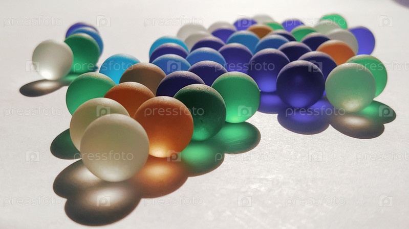 Игровые кликеры или цветные стеклянные шарики, разбросанные по белому фону. заднее освещение