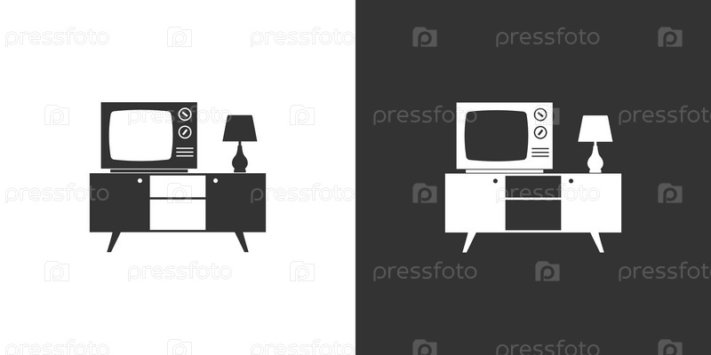 Иконка ретро телевизора на тумбочке с настольной лампой. Черная и белая