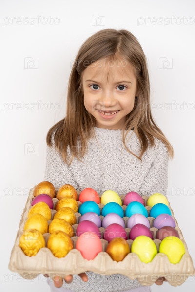 Маленькая красивая девочка позирует в студии с крашеными яйцами к пасхе