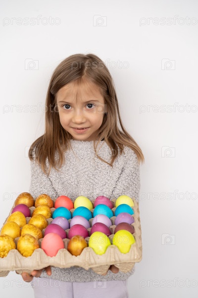Маленькая красивая девочка позирует в студии с крашеными яйцами к пасхе