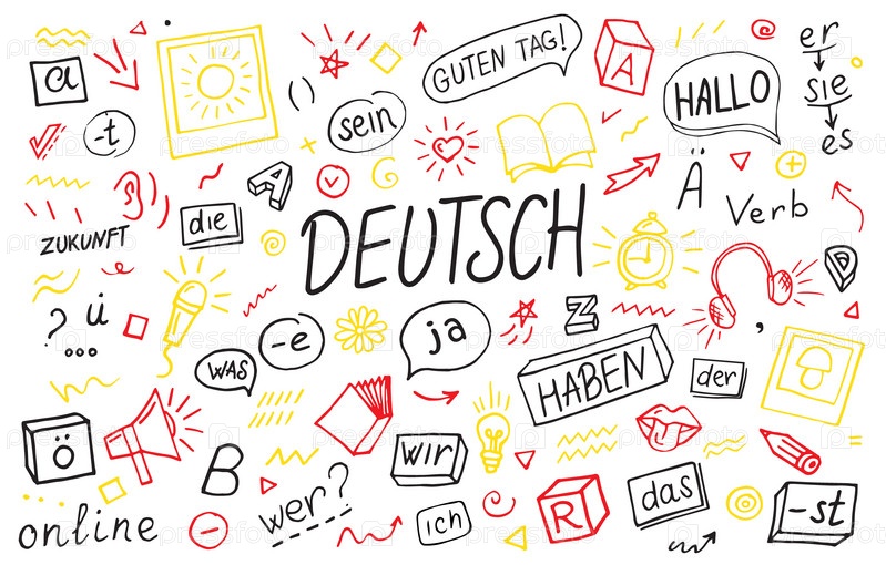 Немецкий. Изучение немецкого языка. Deutsch. Интерпретирующий язык онлайн. Концепция обучения немецкому языку векторная иллюстрация doodle