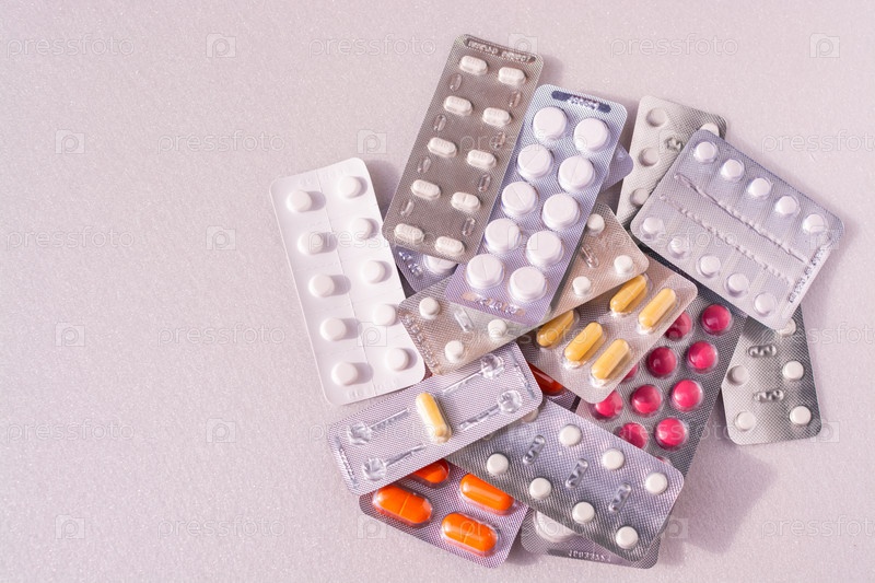 На столе лежат разные таблетки в упаковках