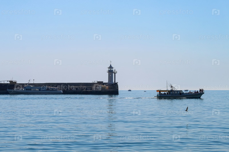Спокойный морской пейзаж. Маленькие прогулочные катера на фоне белой башни старого маяка. Ялта, Крым
