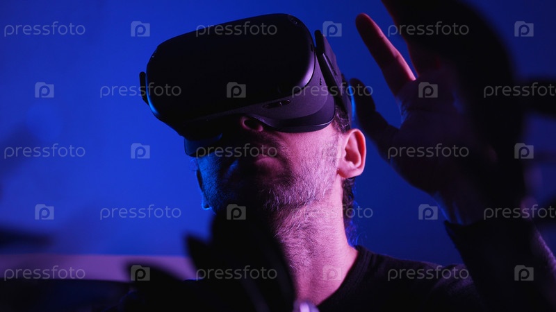 Большой план мужчины в очках виртуальной реальности в темной комнате с голубым светом. В передней пленке находится комнатный цветок. VR-шлем для развлечений, обучения и игр