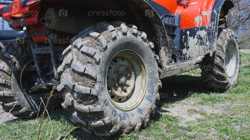 Крупный план грязного колеса красного квадроцикла на заднем плане в горах. Экстремальный вид активного отдыха. Туристическая поездка на квадроцикле