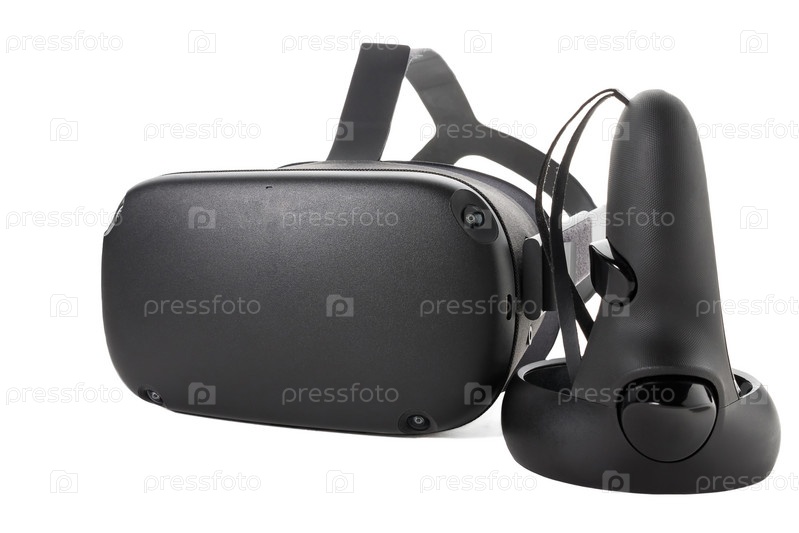 Большой план джойстика и шлем VR на белом фоне. Контроллер и очки виртуальной реальности. Вид спереди со стороны