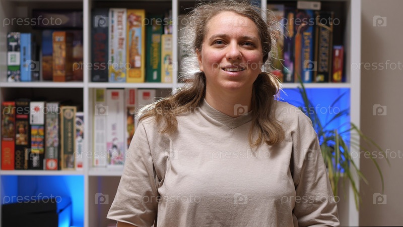 Пухлая девушка в серой футболке улыбается перед стойкой с настольными играми