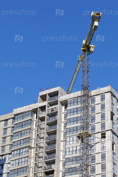 Строительная площадка. Железобетонный каркас многоэтажного дома и строительные краны. Заключительный этап строительства. На фоне голубого неба