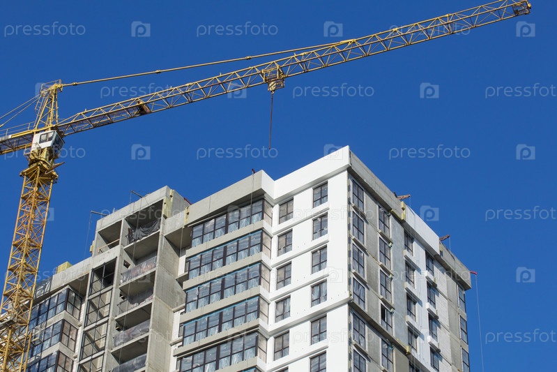 Строительная площадка. Железобетонный каркас многоэтажного дома и строительные краны. Заключительный этап строительства. На фоне голубого неба