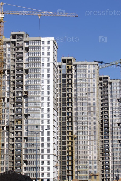 Строительная площадка. Железобетонные каркасы многоэтажных домов и строительных кранов. На фоне голубого неба