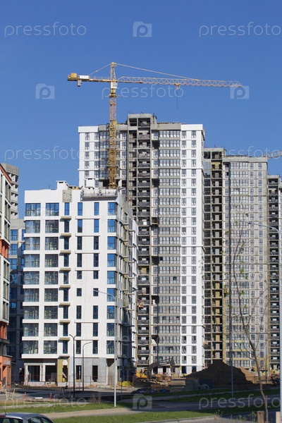 Строительная площадка. Железобетонные каркасы многоэтажных домов и строительных кранов. Заключительный этап строительства. На фоне голубого неба