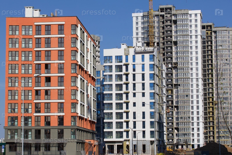 Строительная площадка. Железобетонные каркасы многоэтажных домов и строительных кранов. Готовые дома рядом. На фоне голубого неба