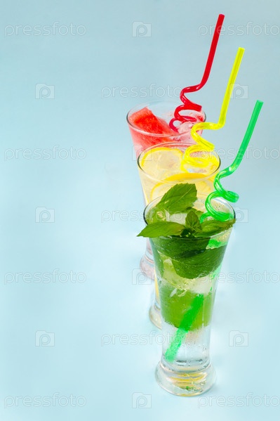 Три стакана охлажденных напитков на синем фоне, лимонад, арбузный лимонад, мятный лимонад, напитки со льдом, чтобы утолить жажду в жаркий летний день