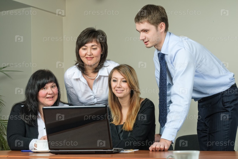 Деловые люди устроили мозговой штурм за ноутбуком в офисе