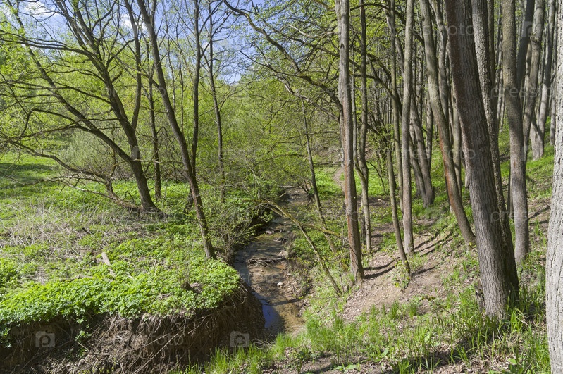 Река Чертановка в верхнем течении. Битцевский лесопарк, Москва. Солнечный день в начале мая