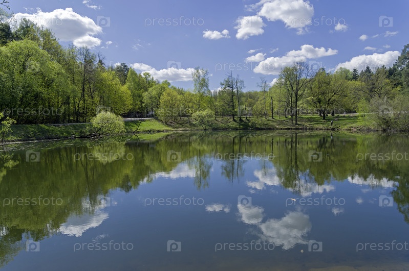 Нижний пруд в каскаде прудов в усадьбе Узкое. Битцевский лесопарк, Москва. Солнечный день в начале мая