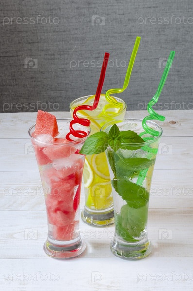 Три стакана с различными безалкогольными напитками, чтобы утолить жажду в жаркий летний день, арбузные, мятные и лимонные напитки со льдом и кусочками фруктов в запотевших стаканах