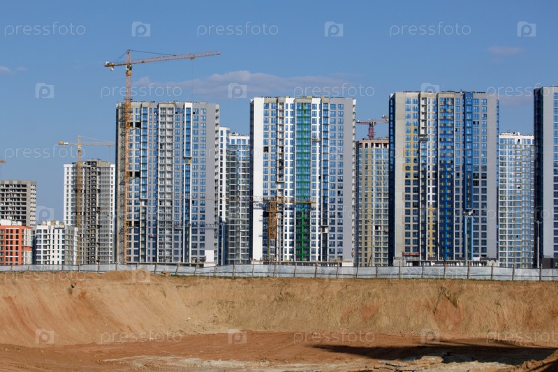 Строительная площадка. Железобетонные каркасы многоэтажных домов и строительных кранов. Заключительный этап строительства. На фоне голубого неба