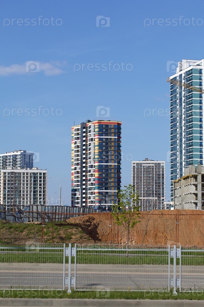 Современные высотные дома из бетона и стекла. Строительная площадка. Заключительный этап строительства. На фоне голубого неба