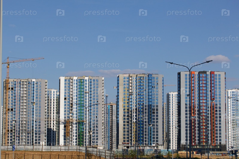 Строительная площадка. Железобетонные каркасы многоэтажных домов и строительных кранов. Заключительный этап строительства. На фоне голубого неба