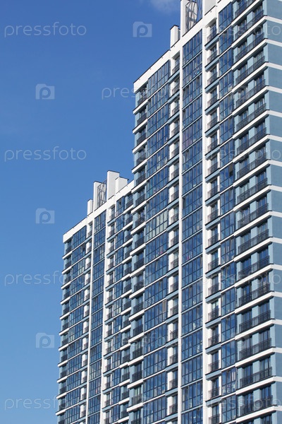 Современные высотные дома из бетона и стекла. Строительная площадка. Заключительный этап строительства. На фоне голубого неба