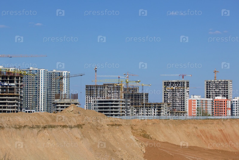 Строительная площадка. Железобетонные каркасы многоэтажных домов и строительных кранов. На фоне голубого неба