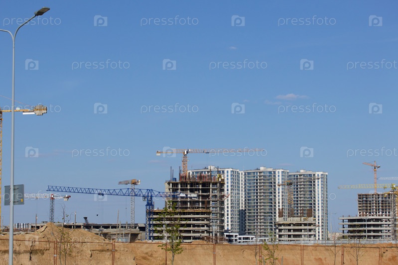 Строительная площадка. Железобетонные каркасы многоэтажных домов и строительных кранов. На фоне голубого неба