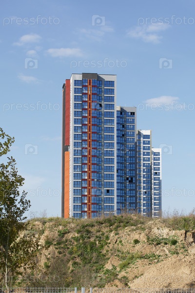 Современные высотные дома из бетона и стекла. Цветовое оформление фасадов. Строительная площадка. Заключительный этап строительства. На фоне голубого неба