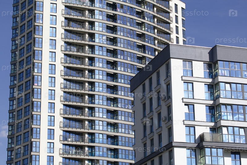 Современные высотные дома из бетона и стекла. Строительная площадка. Заключительный этап строительства. На фоне голубого неба