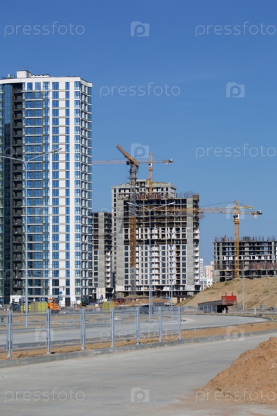 Строительная площадка. Железобетонные каркасы многоэтажных домов и строительных кранов. Заключительный этап строительства. На фоне голубого неба