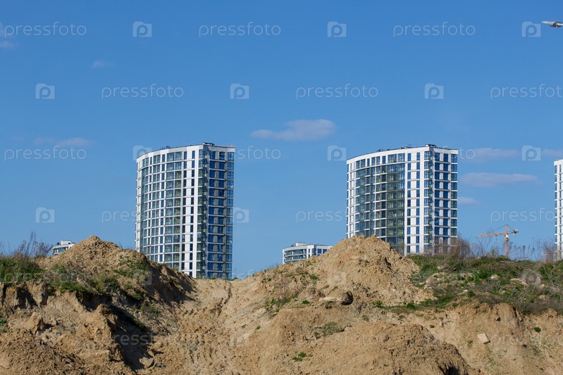Современные высотные дома из бетона и стекла. Цветовое оформление фасадов. Строительная площадка. Заключительный этап строительства. На фоне голубого неба