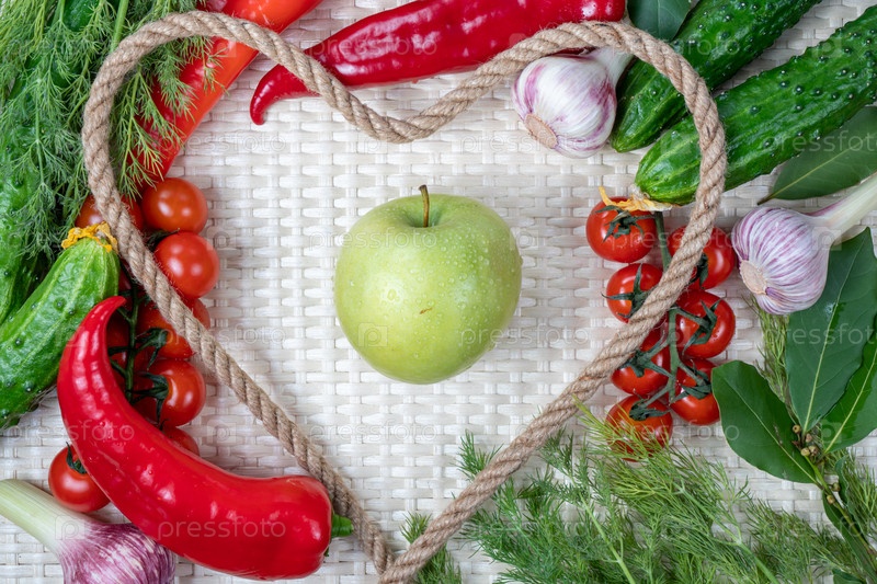 Композиция на светлом фоне из свежих органических вегетарианских продуктов: помидоры, вишня, чеснок, лук, огурцы, лаврушка, перец, укроп. Вид сверху, крупный план. Здоровая, здоровая пища