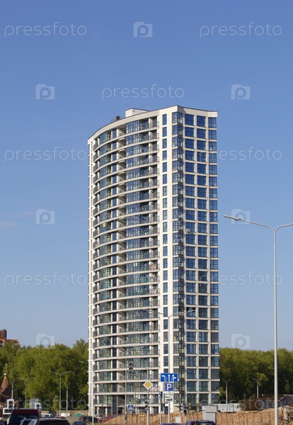 Современные высотные дома из бетона и стекла. Строительная площадка. Заключительный этап строительства. На фоне голубого неба