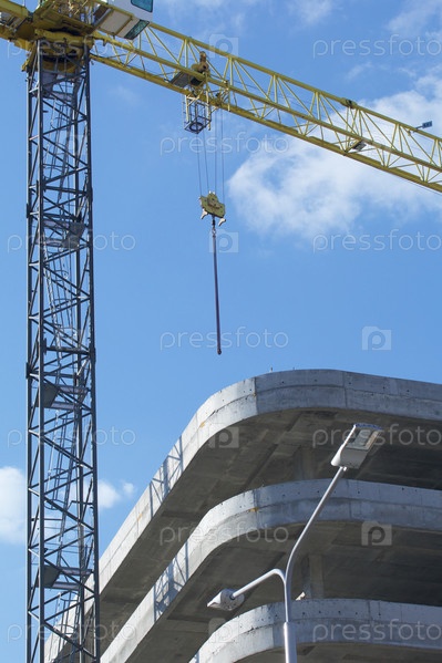 Строительная площадка. Железобетонные каркасы многоэтажных домов и строительных кранов. На фоне голубого неба