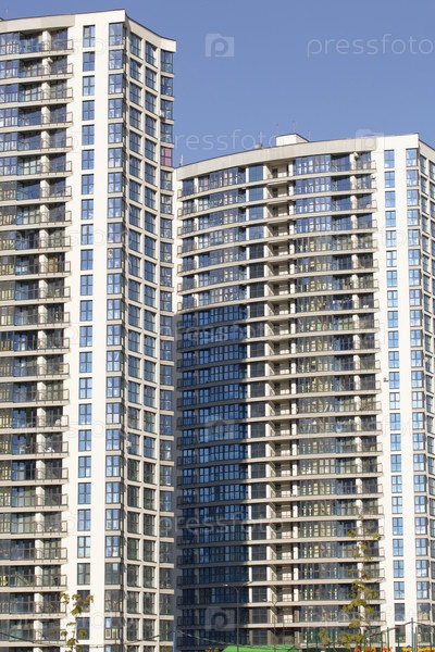 Современные высотные дома из бетона и стекла. Строительная площадка. Заключительный этап строительства. На фоне голубого неба