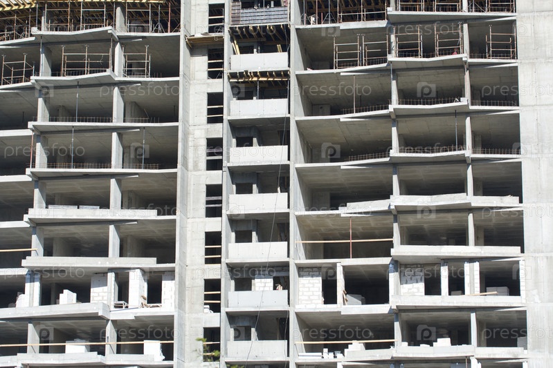 Каркас дома из железобетона. Современные высотные дома из бетона и стекла. Строительная площадка. Заключительный этап строительства