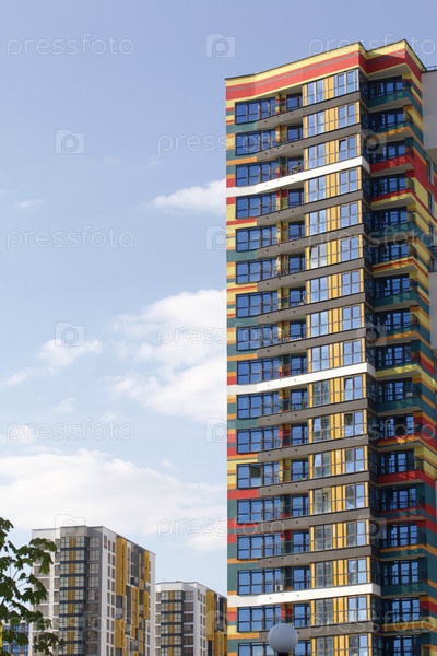 Современные высотные дома из бетона и стекла. Цветовое оформление фасадов. Строительная площадка. Заключительный этап строительства. На фоне голубого неба