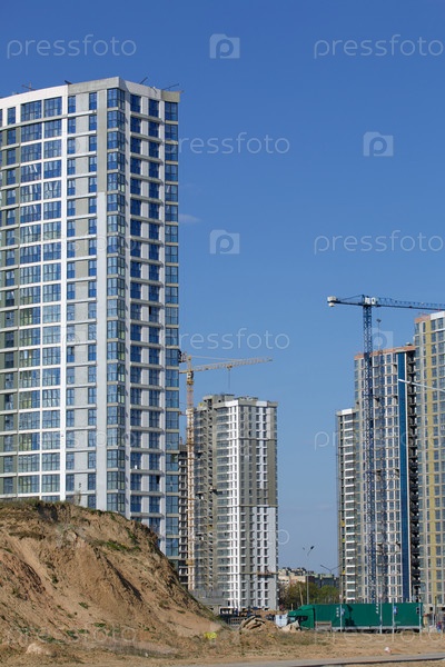 Строительная площадка. Железобетонные каркасы многоэтажных домов и строительных кранов. Заключительный этап строительства. На фоне голубого неба