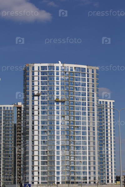 Строительная площадка. Железобетонные каркасы многоэтажных домов и строительных кранов. Готовые дома рядом. На фоне голубого неба