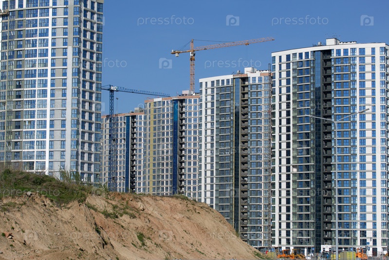 Строительная площадка. Железобетонные каркасы многоэтажных домов и строительных кранов. Заключительный этап строительства. На фоне голубого неба