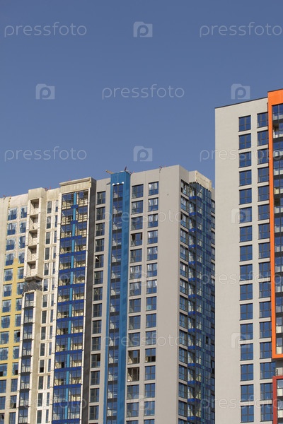 Современные высотные дома из бетона и стекла. Цветовое оформление фасадов. Строительная площадка. Заключительный этап строительства. На фоне голубого неба