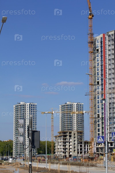Строительная площадка. Железобетонные каркасы многоэтажных домов и строительных кранов. Заключительный этап строительства. На фоне голубого неба