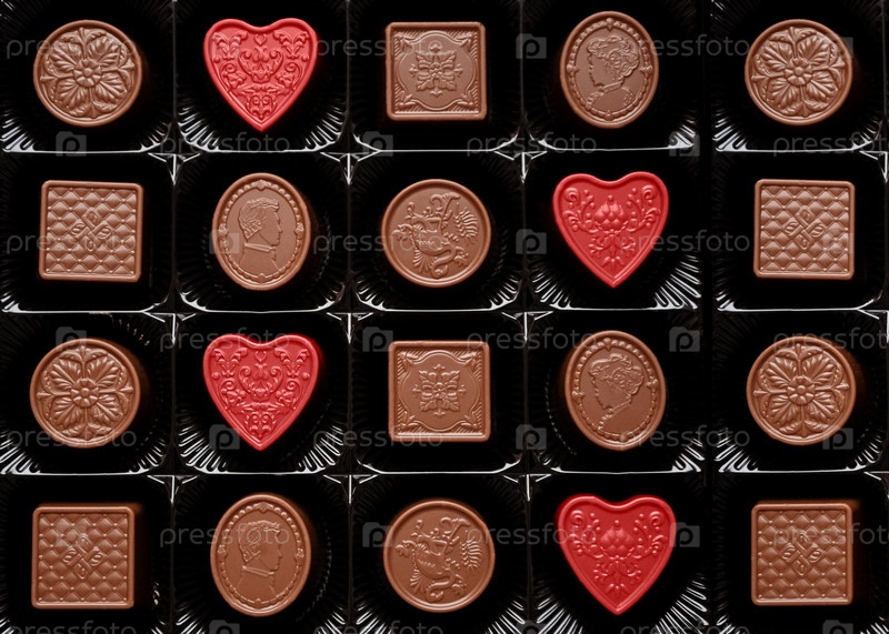 Вид сверху на шоколадный набор с разной формой и фоном из красных конфет в форме сердца