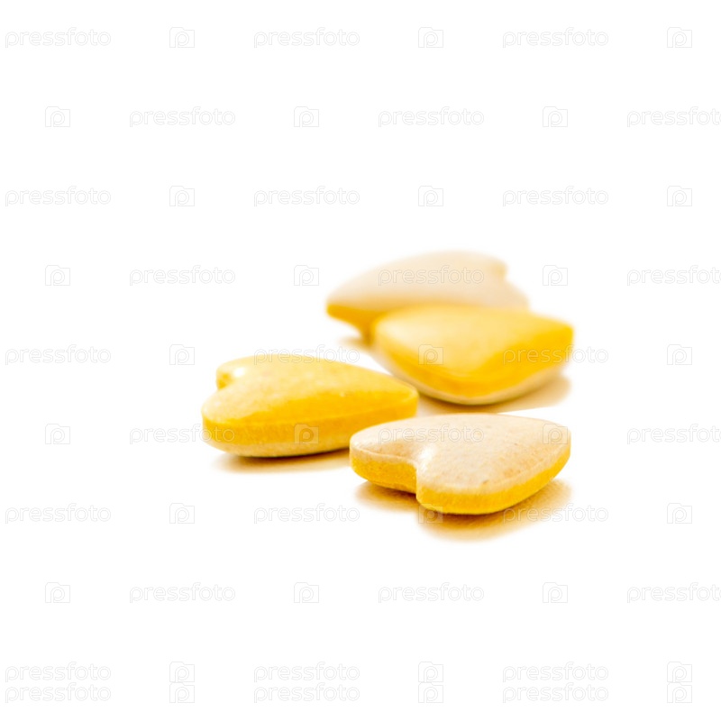 Желтые витаминные таблетки в форме сердца на белом фоне