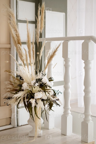 Декоративная цветочная композиция из сухоцветов в вазе стоит на крыльце деревенского дома