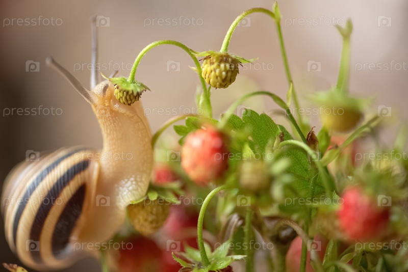 Милая садовая улитка ест ягоды земляники