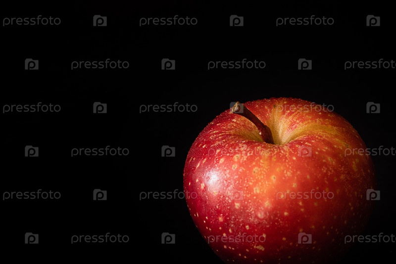 Свежее спелое красное яблоко с каплями воды на глянцевой кожуре на черном фоне