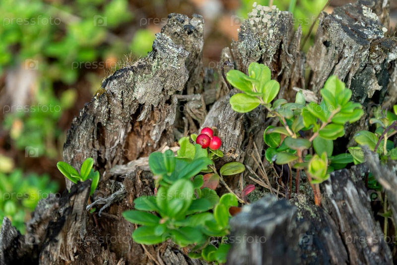 Зеленые кусты дикой брусники с красными спелыми ягодами выросли в старом пне