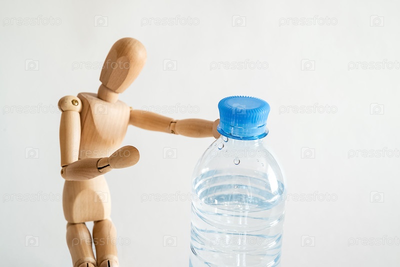 Деревянный манекен держит пластиковую бутылку с водой. Питьевая вода, здоровый образ жизни