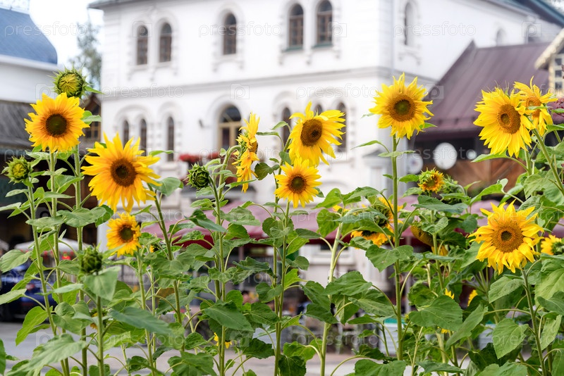 Цветущие подсолнухи на фоне дома в русском стиле